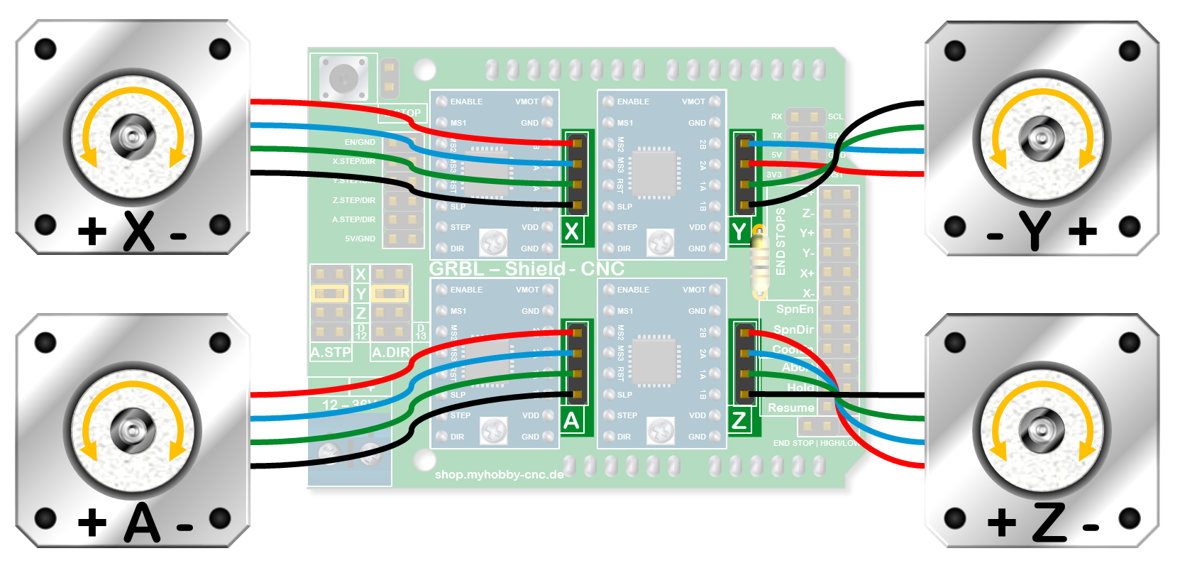 Die vier Motoren werden alle gleich angeschlossen, bis auf einen Motor der Y-Achse, bei dem eine Spule verdreht angeschlossen wird, damit er in die andere Richtung dreht. Dies ist wichtig für die Y-Achse, deren beiden Moteoren sich ja gegenüber stehen und darum in entgegengesetzte Richtungen laufen müssen! (In der Abbildung sind die Anschlüsse Y und A für die Y-Achsen.)